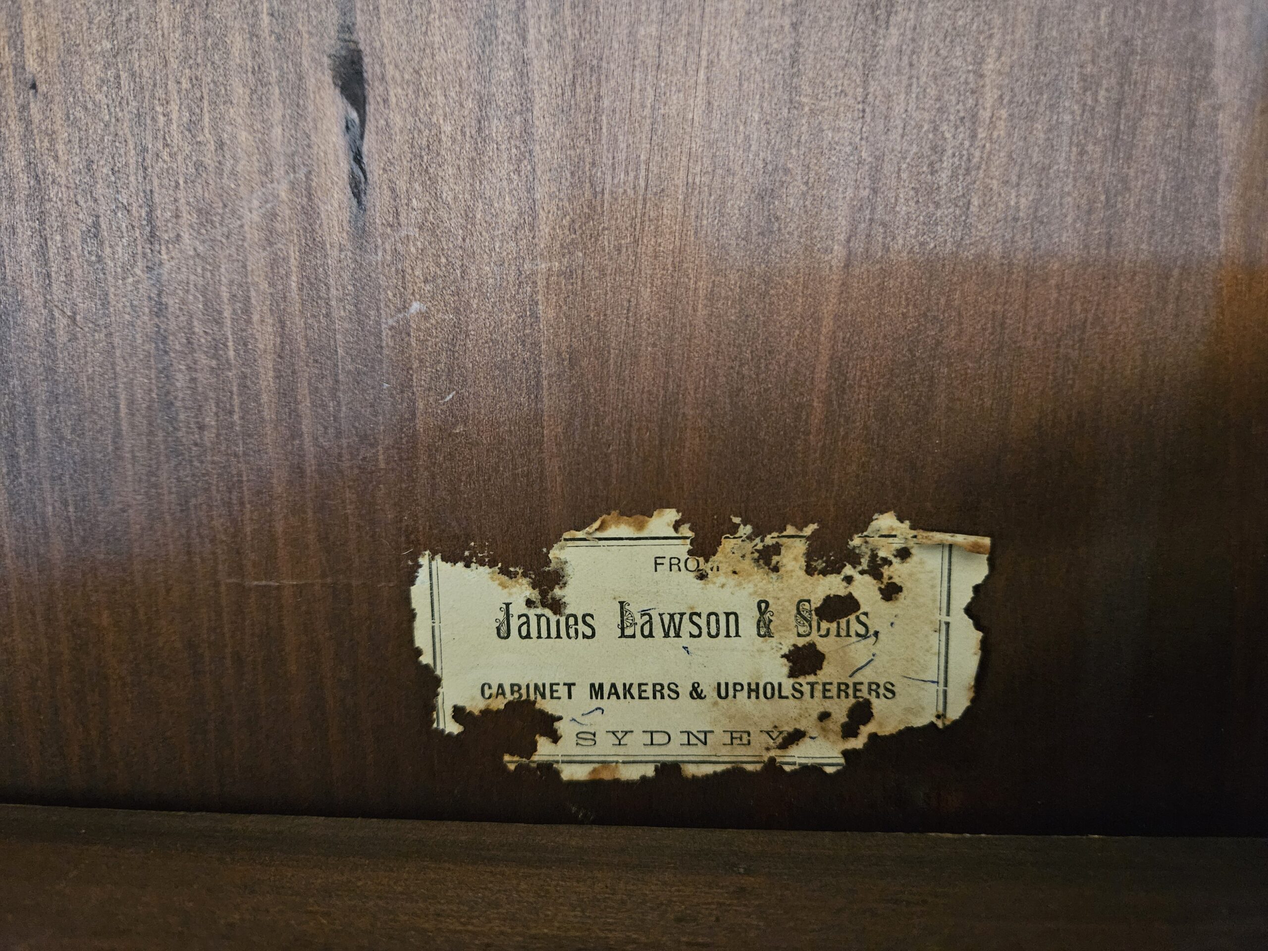 A magnificent New South Wales native walnut (endiandra globosa) library bookcase c1880.In crisp Neo Classical revival mode. Mint condition. – original bevelled plate glass doors, shelves, shelf brackets, key & polish. Labelled by the maker James Lawson & Sons, Sydney (active 1855 -1898). Probably designed by his son William who did the furniture designs for the company. James (1836-1926) was a Scottish trained cabinet maker who arrived in Sydney in 1855. He exhibited NSW walnut furniture at the Sydney Intercolonial Exhibition in 1870. At the Sydney International Exhibtion in 1879 he won prizes for furniture in NSW mahogany, rewarewa wood, NSW beech & NSW ash. His eldest son James Robert founded later the auctioneering firm that survives to this day. It could be argued this is the finest surviving late 19th century Australian library bookcase. The maker’s use of native timber, largely now unknown offers exciting prospects for collectors of Australian native timber cabinet making. 258cm H x 1900 x 510mm D. $6,500.