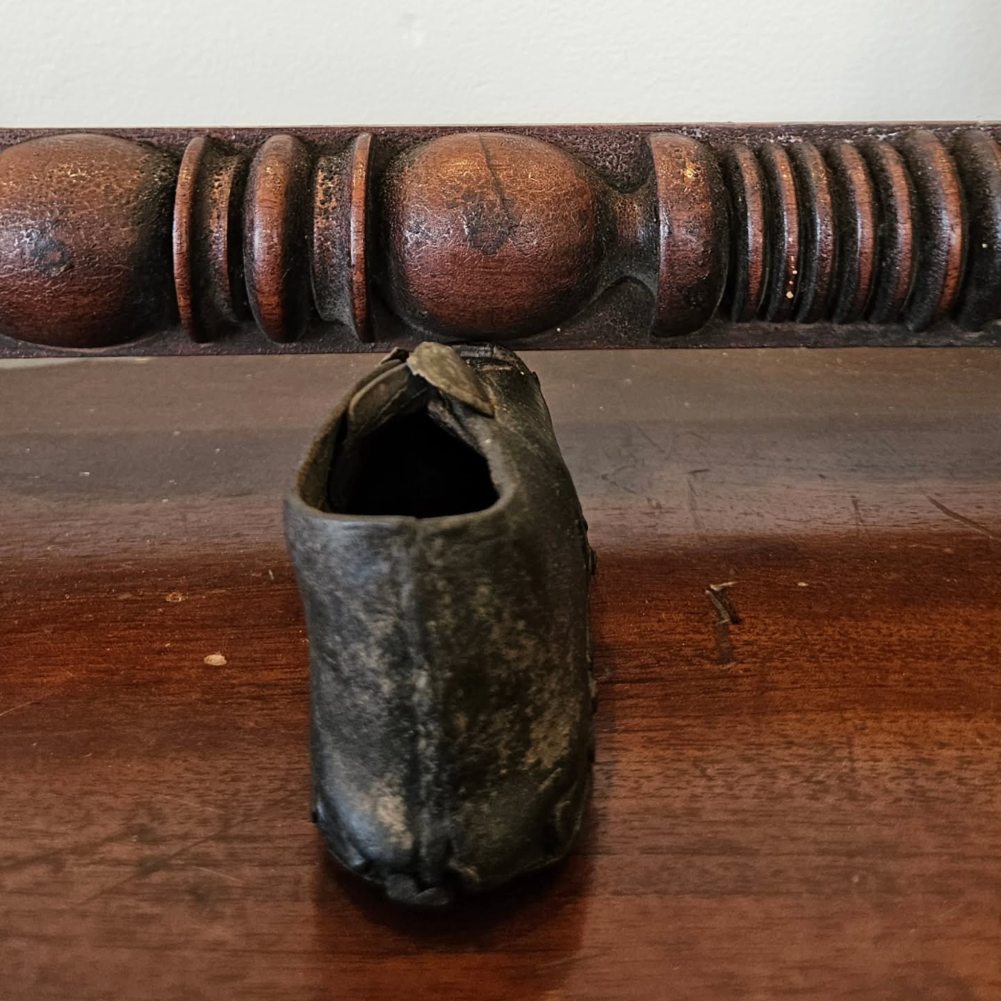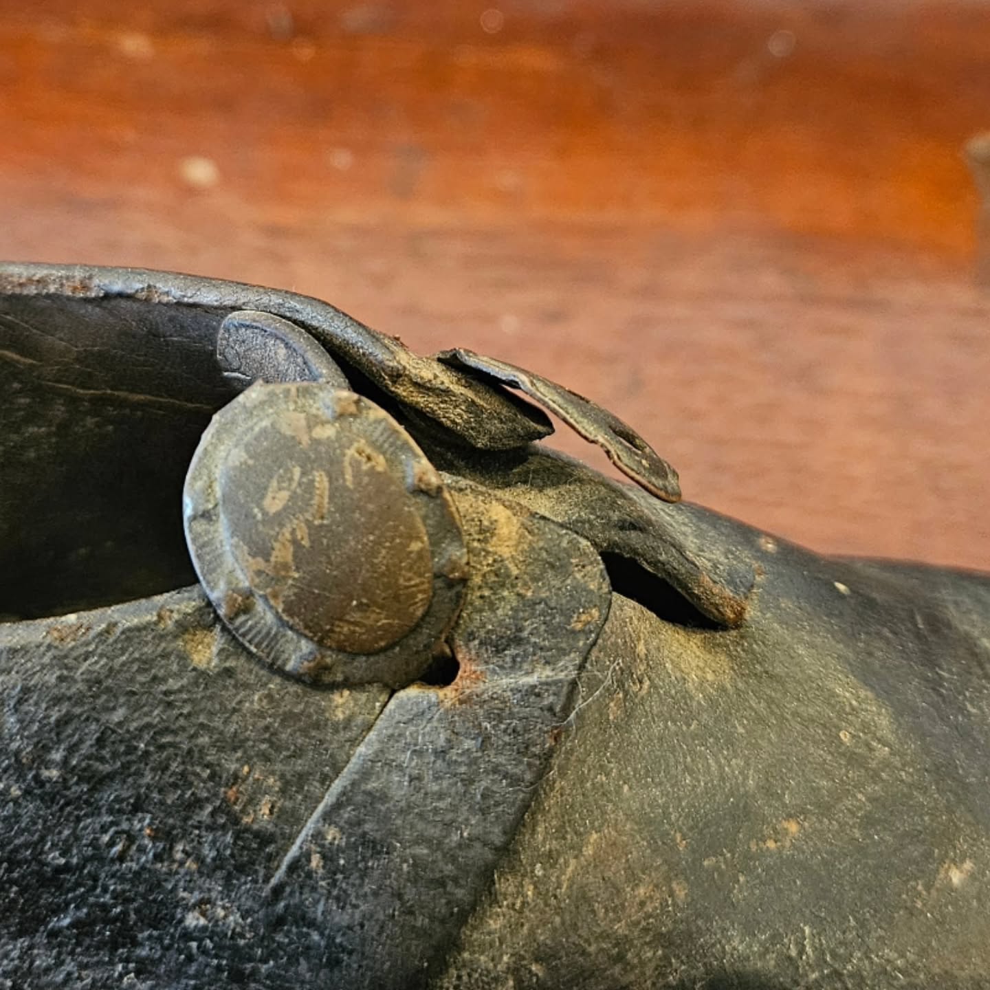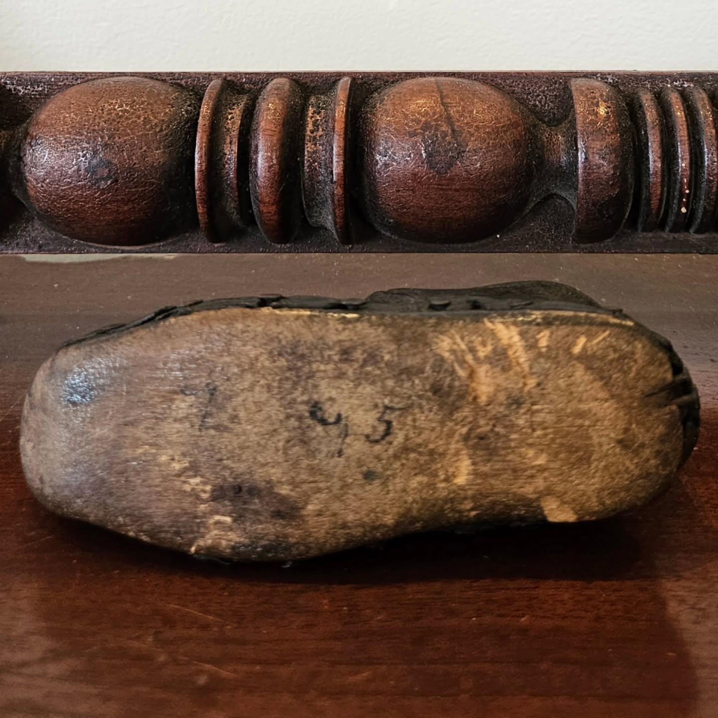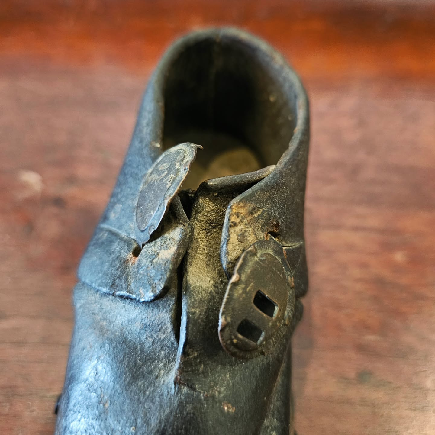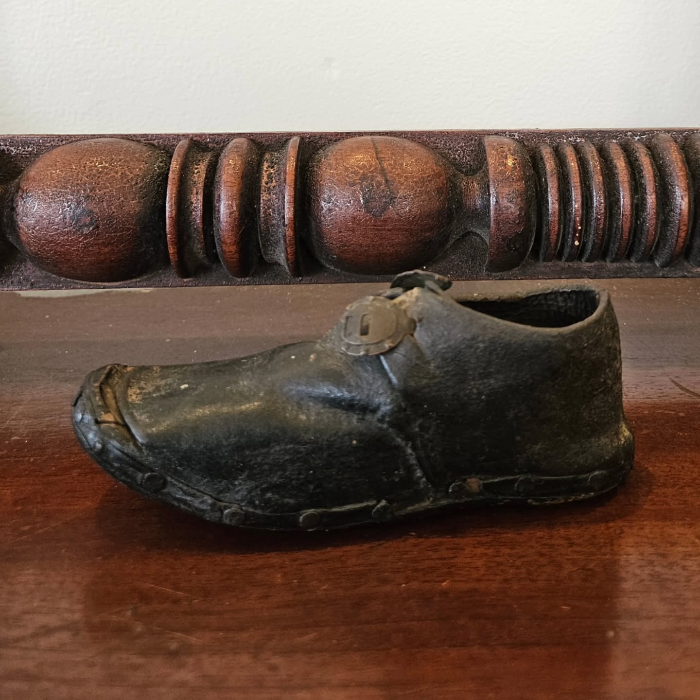 A rare 19th century Australian Colonial period child’s best Sunday shoe, leather & timber with original pair of star studded brass buckles. A terrific model for a modern shoe maker.