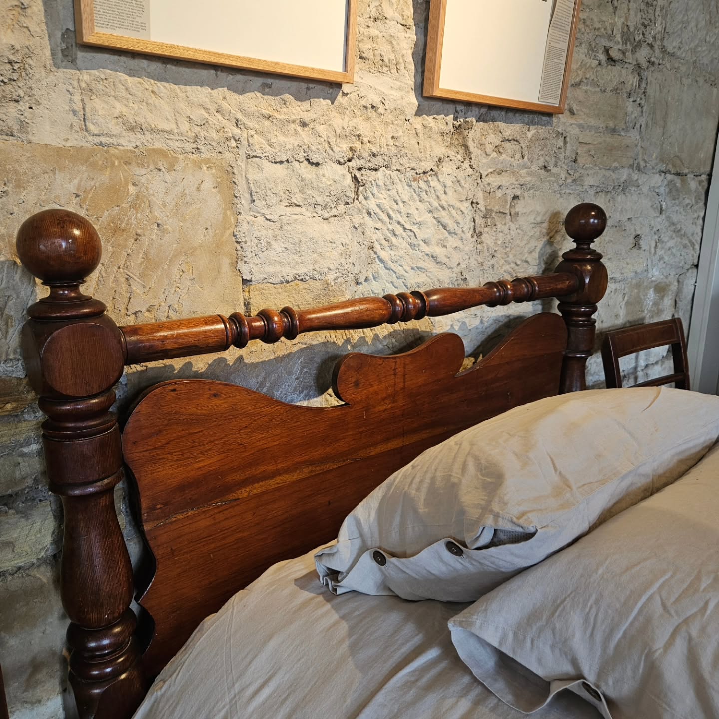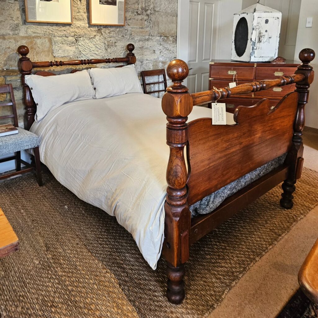 Day 9. A terrific Tasmanian blackwood Colonial period double farmhouse bed c1850. Excellent quality turnings & lovely rich patina. A cosy double bed, it is 3cm narrower than a standard double. Shown with a 3/4 bed mattress). The rails longer than a modern at 195cm.