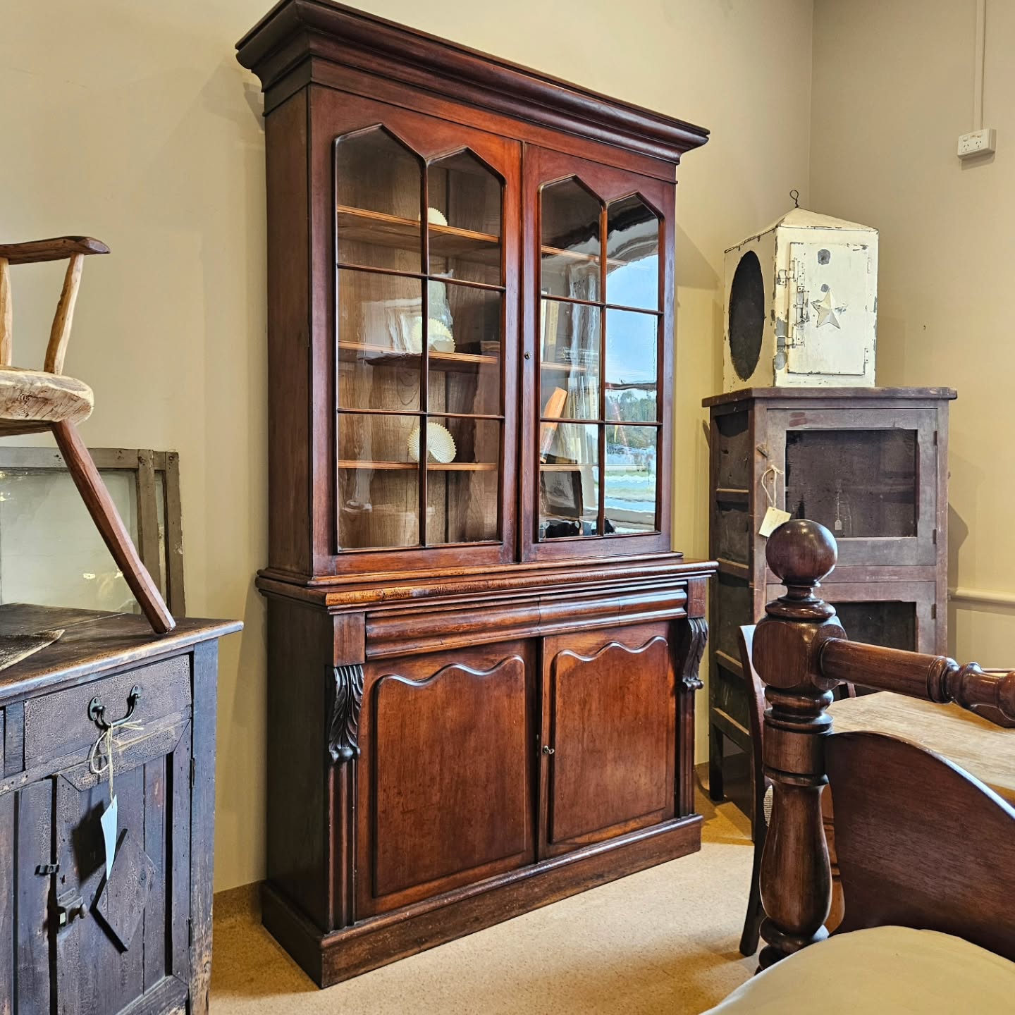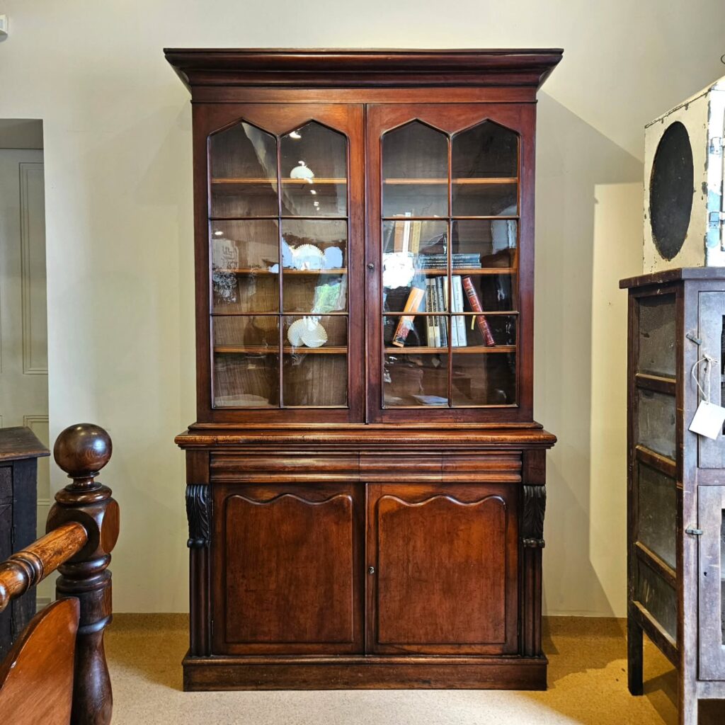 Tasmanian early Colonial period library bookcases, of which this a fine example, are surprisingly rare. In extraordinary original condition, this example just in offers a wonderful alternative to modern shelving. And deep enough for modern books. Finely carved Grecian buttresses to the base pilasters & a fine Grecian pediment, elegant ‘Gothick’ glazing bars, all original crown glass, shelves & shelf buttons, single wide drawer & cupboards below, with a lovely patina