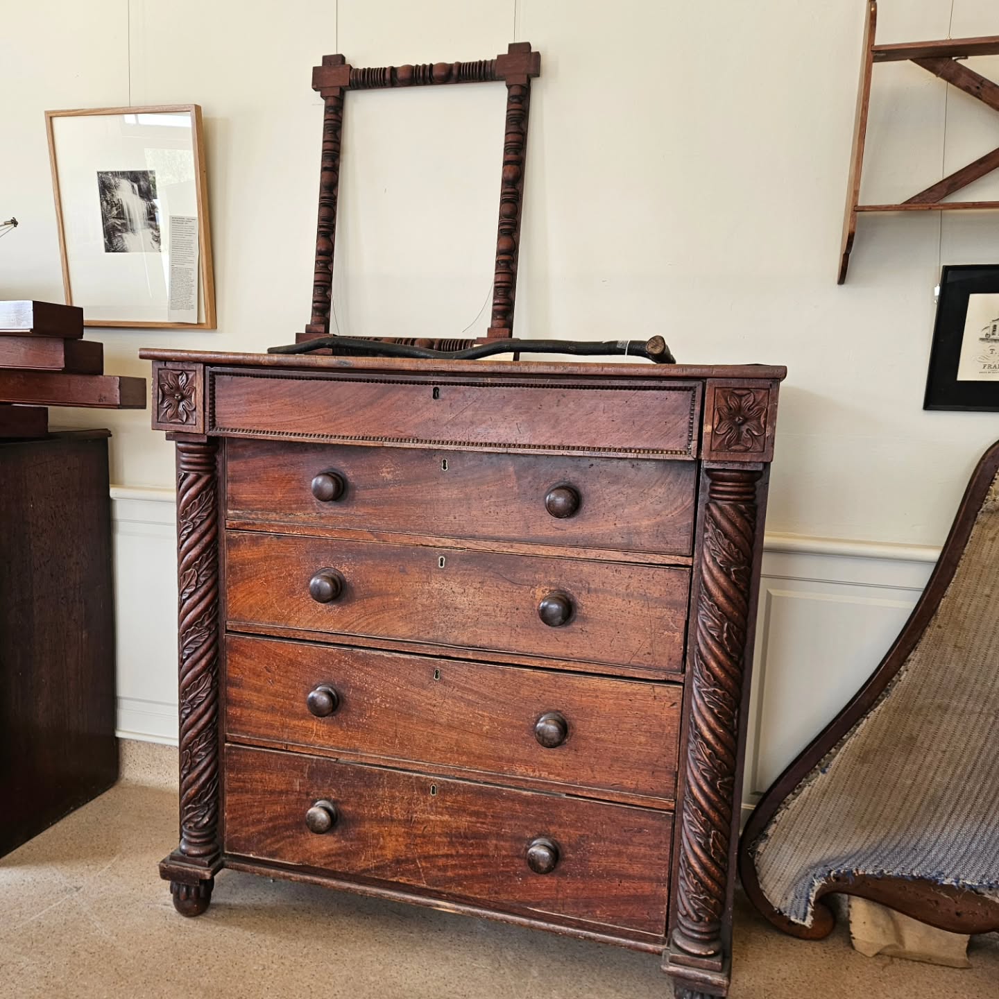 Two Tasmanian Colonial period Australian cedar ‘pole’ chest of drawers, the left c1830, supplied for Enfield, Bishopsbourne, Tasmania, the home of William Field (1774 -1837), Government butcher & his convict publican mistress Elizabeth Richards. With beautifully carved, acanthus wrapped ‘quilled on the cann’ half columns & sub rosa panels.